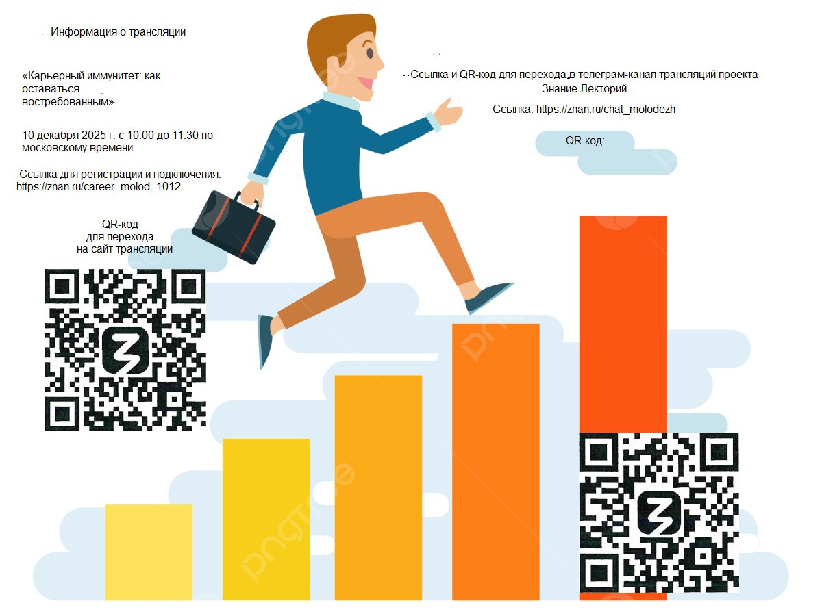 В рамках Проекта 10 декабря 2025 г. с 10:00 до 11:30 по московскому времени состоится онлайн-встреча на тему «Карьерный иммунитет: как оставаться востребованным» (далее — трансляция, прямой эфир). В рамках прямого эфира приглашенные эксперты рассмотрят успешные стратегии построения карьеры и поделятся секретами поддержания баланса между работой и личной жизнью. Зрители смогут задавать свои вопросы лекторам в режиме реального времени в телеграм-канале трансляций Проекта. Ссылка и QR-код для перехода в телеграм-канал приведены ниже.
