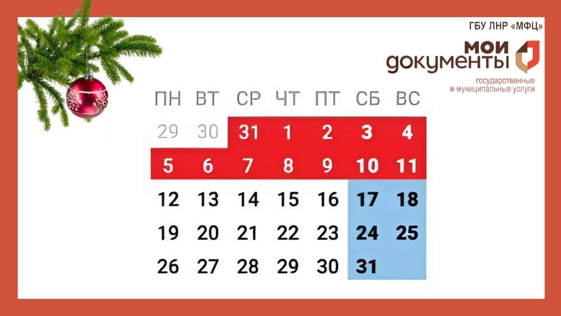 Чтобы заблаговременно спланировать получение государственных и муниципальных услуг в ГБУ ЛНР "МФЦ" в период новогодних праздников, просим обратить внимание на график работы отделений и ТОСПов в предпраздничные и праздничные дни: