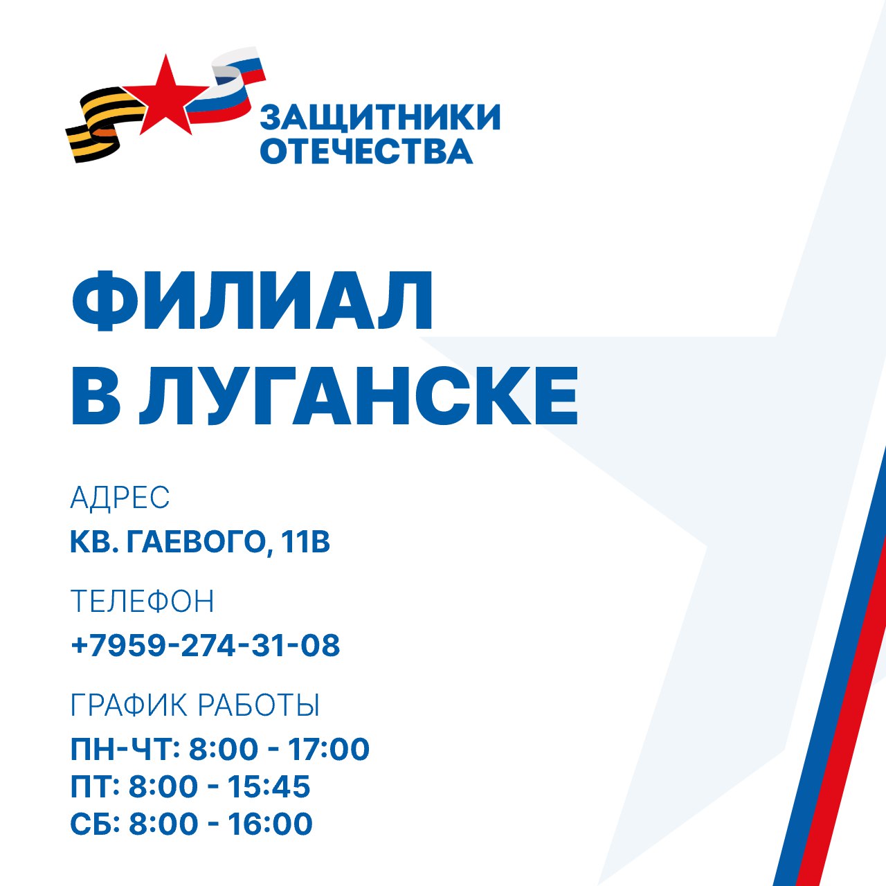 Мы стремимся стать доступнее и удобнее для вас. Чтобы каждый мог получить необходимую поддержку в удобное время, филиал фонда «Защитники Отечества» в Луганской Народной Республике переходит на обновленный график работы.