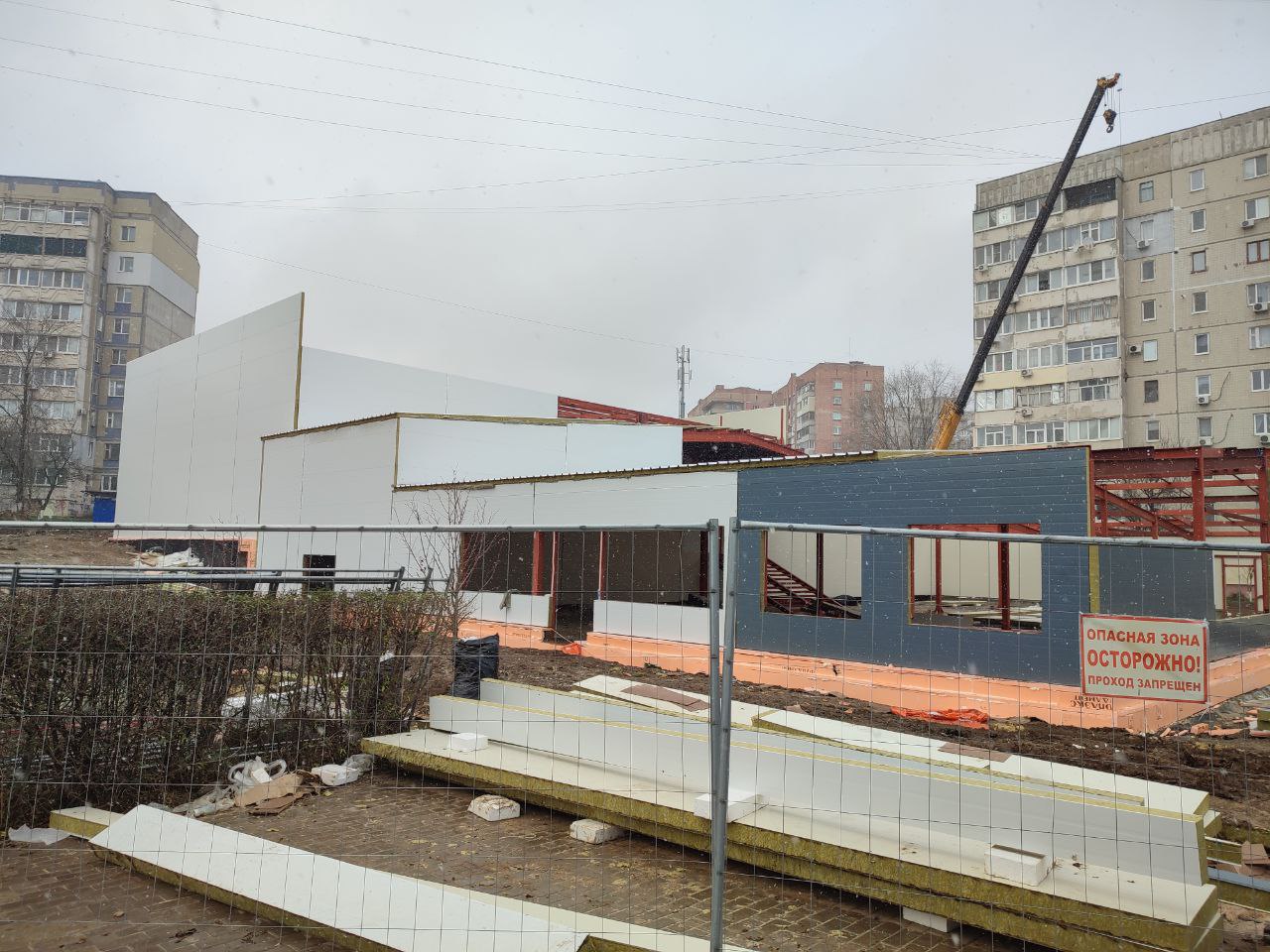 Сейчас рабочие укладывают крышу из утеплённых панелей