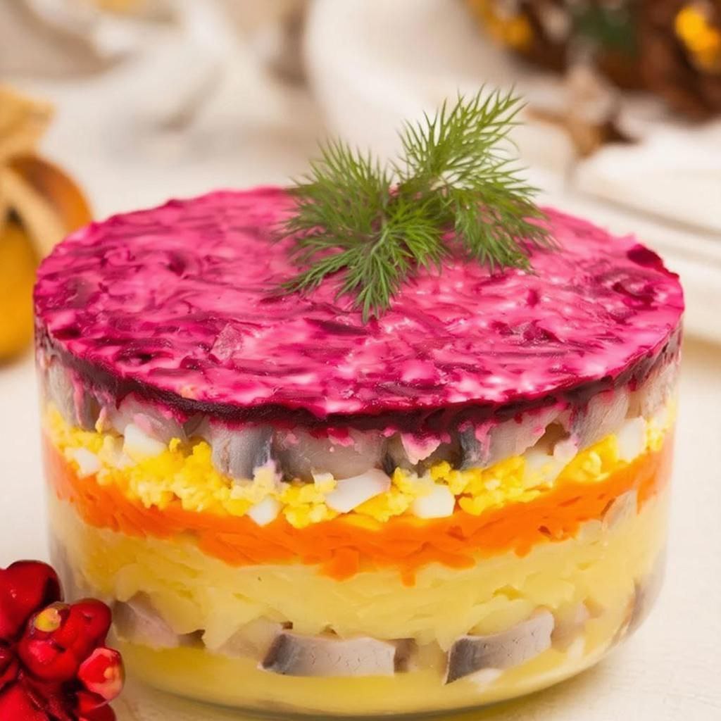 «Селёдка под шубой» — ещё одна любимая новогодняя закуска. В классическом варианте она включает слоями нарезанный сладкий лук, мелко нарезанные отварные овощи (картофель, морковь, свёкла), а также сырой или отварной сельдь, покрытые майонезом. Каждая хозяйка знает, как правильно подготовить и нанести слои, чтобы селёдка была сочной, а «шуба» — воздушной и равномерной. Часто добавляют небольшие секреты — например, тонкое натирание овощей или использование определённых видов майонеза.