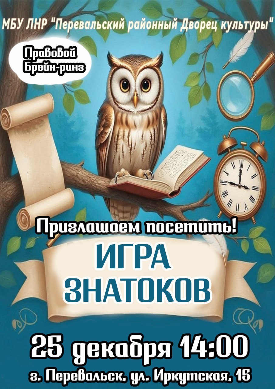 25 декабря 2025 года приглашаем в Перевальский районный Дворец культуры (ул. Иркутская, 15) на «Интеллектуальные игры знатоков», которые пройдут в формате правового брейн-ринга.