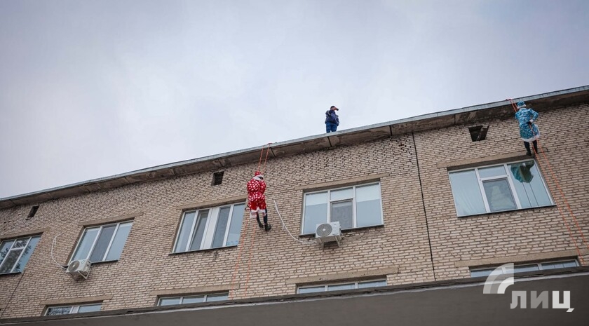 Студенты-спасатели в костюмах Деда Мороза и Снегурочки спустились с крыши с помощью альпинистского снаряжения, поздравили детей и вручили сладкие наборы, которые московские волонтеры ранее передали в ЛНР.
