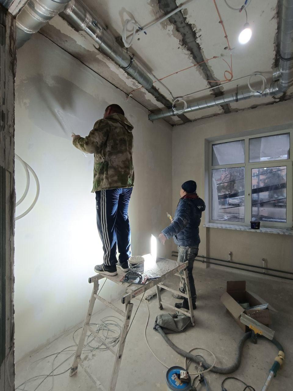 "Работы по фасаду идут в плановом порядке, также внутри продолжаются работы по укладке плитки, монтаж вентиляции", - прокомментировал заказчик.