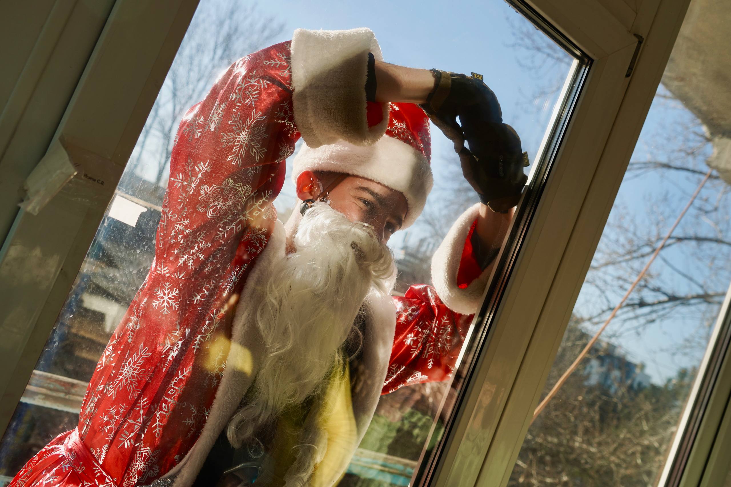 Сегодня Дед Мороз и Снегурочка, прошедшие специальную подготовку, при помощи альпинистского снаряжения спустились с крыши Луганской республиканской детской клинической больницы, вручая детям сладкие подарки. Впереди ещё один десант, а значит – ещё одно чудо!