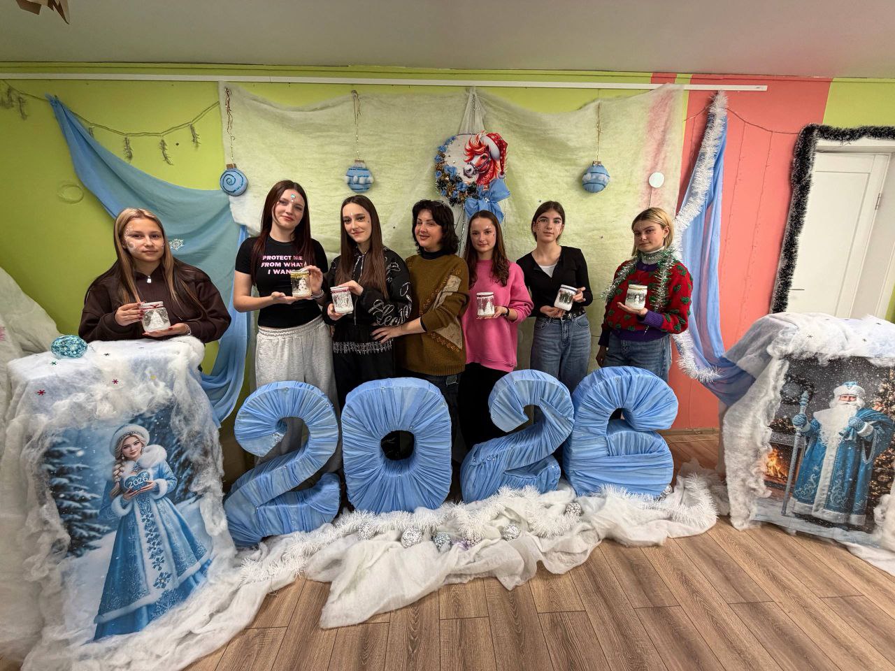 Девочки с увлечением наносили на стекло праздничные узоры, словно рисуя зимние сказки. А затем, словно по волшебству, баночки засияли благодаря мерцающим стразам, превращаясь в основу для светильников, готовых наполнить дом теплом и уютом.