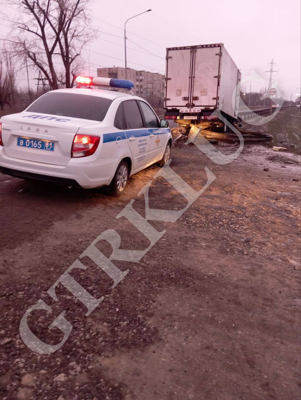 Грузовая машина съехала с дороги и попала в кювет, сбив ограждение и потеряв передние колеса