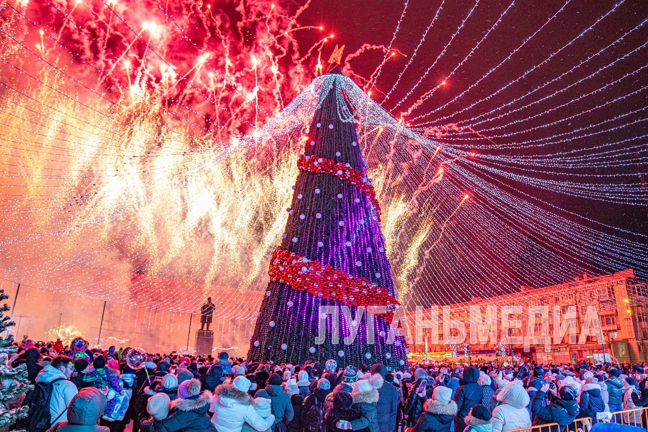 На центральной площади столицы ЛНР прошла торжественная церемония зажжения иллюминации новогодней елки.