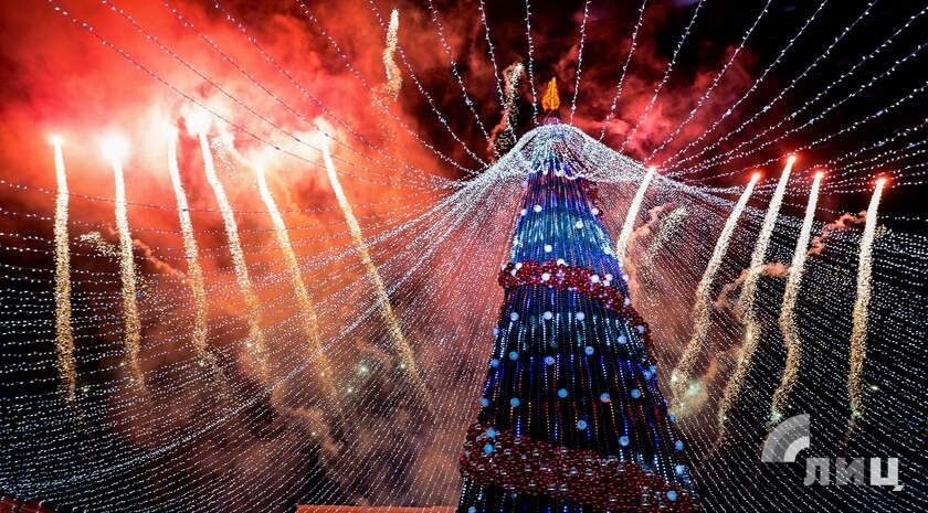 Праздничная иллюминация главной новогодней елки ЛНР и золотого шатра зажглась на Театральной площади в центре Луганска. Об этом с места события передает корреспондент ЛИЦ.