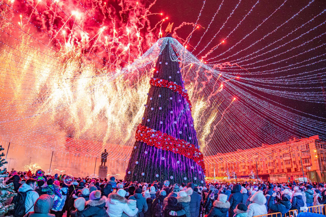 Главная новогодняя елка республики, установленная на центральной площади Луганска, зажгла свои огни