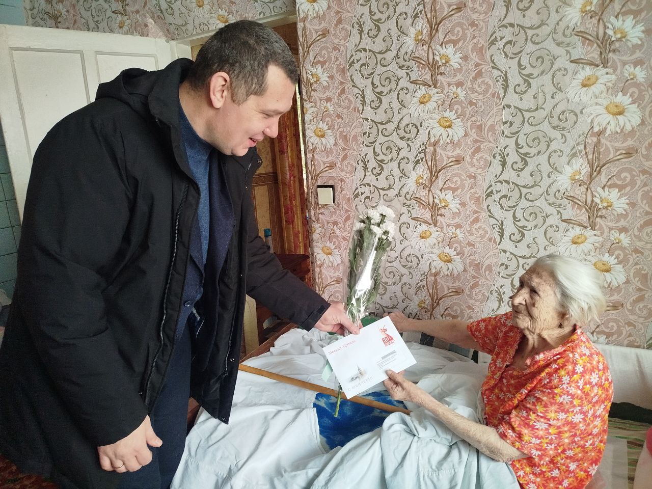 Поздравить уважаемую юбиляршу с такой знаменательной датой прибыл заместитель Главы городского округа Александр Каменский. Он передал Александре Алексеевне теплые слова поздравления и личное послание от Президента России Владимира Владимировича Путина.