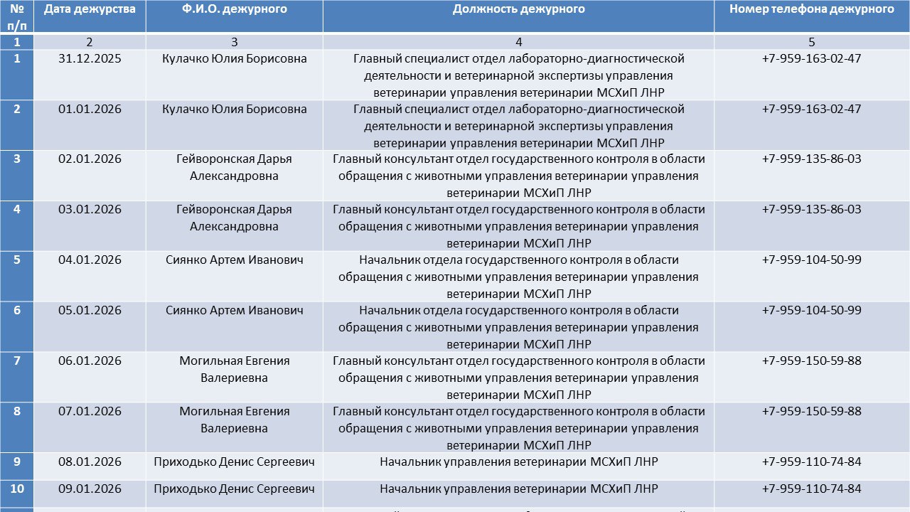 С 31 декабря 2025 года по 11 января 2026 года будет организовано дежурство специалистов для оперативного реагирования на вопросы, связанные с ветеринарным благополучием и обеспечением эпизоотической безопасности.