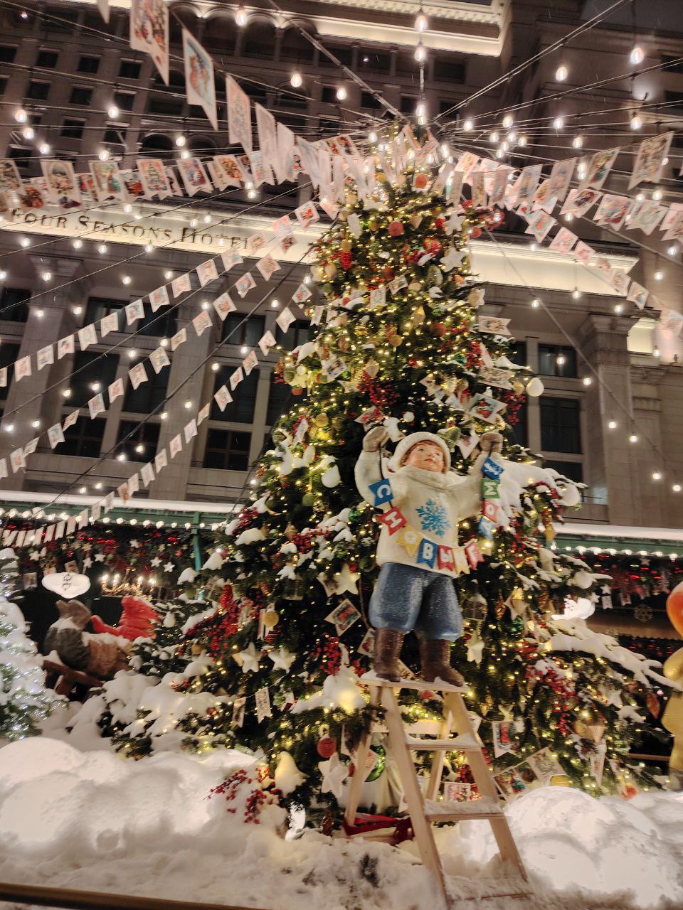 Мы гуляли по заснеженным улицам, и каждый уголок — от огромных, сияющих площадей до тихих, украшенных гирляндами переулков — был наполнен ожиданием чуда, улыбками и ароматом мандаринов и корицы. Город был похож на огромную, сверкающую шкатулку с драгоценностями.
