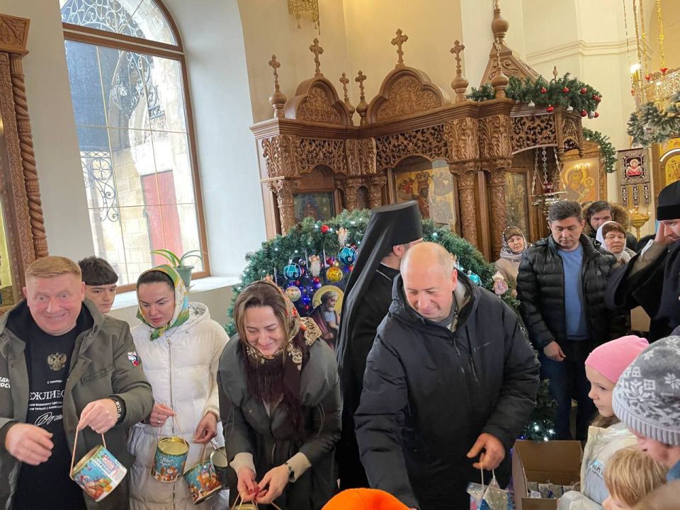 После богослужения вместе с Архимандритом Иоанном и первым заместителем Секретаря Луганского регионального отделения ВПП "Единая Россия" Василием Леоновым вручили сладкие подарки детям, пришедшим в храм с родителями.