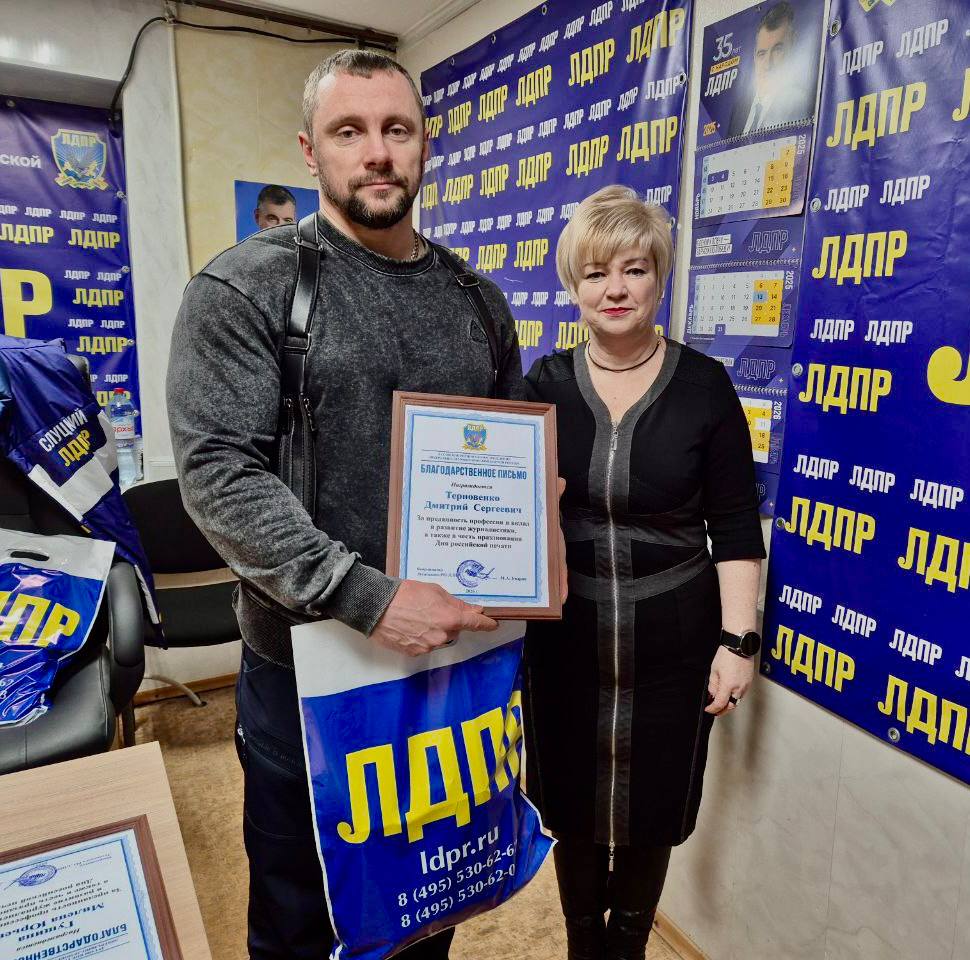 Депутат Совета Ровеньковского городского округа от фракции ЛДПР Елена Польжок поздравила журналистов Дмитрия Терновенко и Милену Гущину с профессиональным праздником — Днём российской печати.