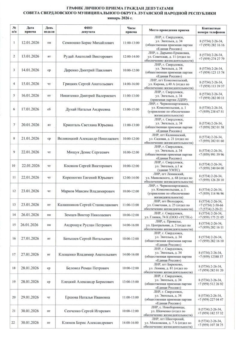 Согласно Постановления Председателя Совета муниципального округа муниципальное образование Свердловский муниципальный округ Луганской Народной Республики №67 от 30.12.2025 «Об утверждении графика приёма граждан депутатами Совета муниципального округа муниципальное образование Свердловский муниципальный округ Луганской Народной Республики», принят ГРАФИК приема граждан депутатами Совета Свердловского муниципального округа на I квартал 2026 г.