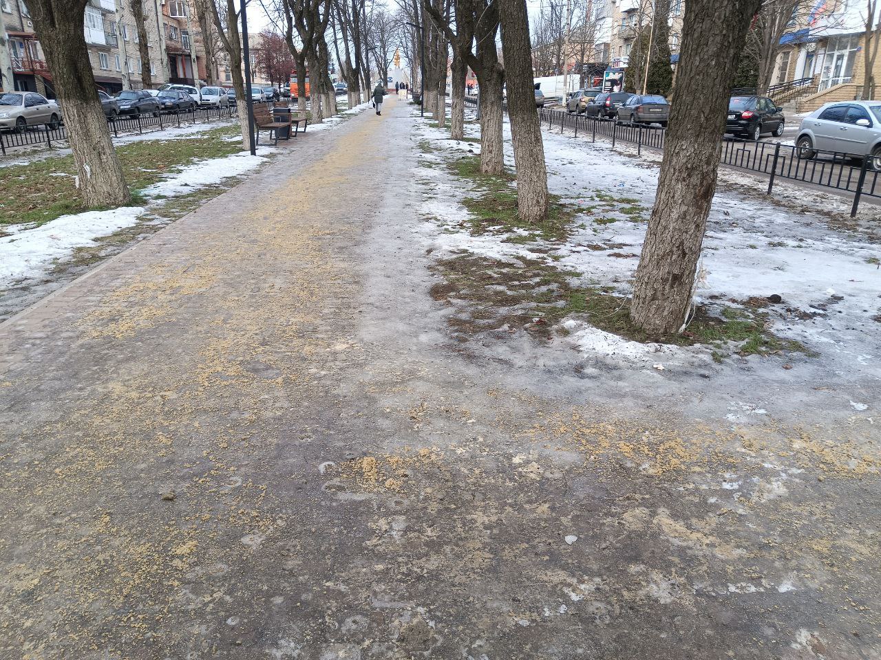 Пешеходные дорожки и аллея по ул.Ленина обработаны песком, что поможет избежать скольжения и травм.