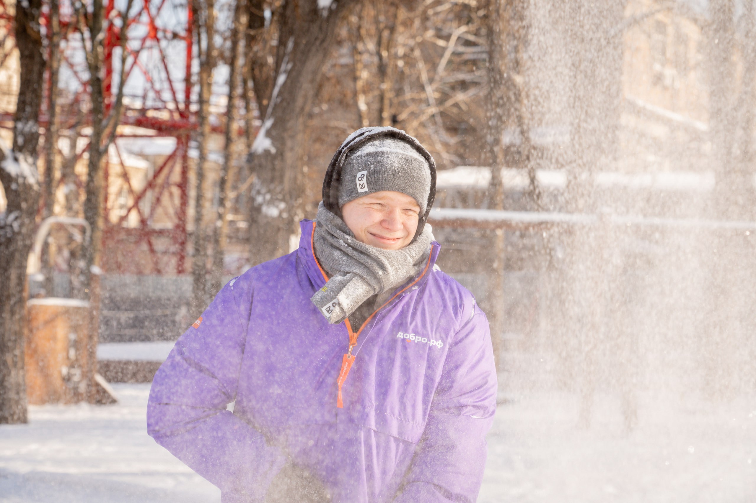 Волонтеры, добровольцы, представители молодёжных организаций и молодёжь Луганска в сквере Молодой гвардии на утренней уборке снега.