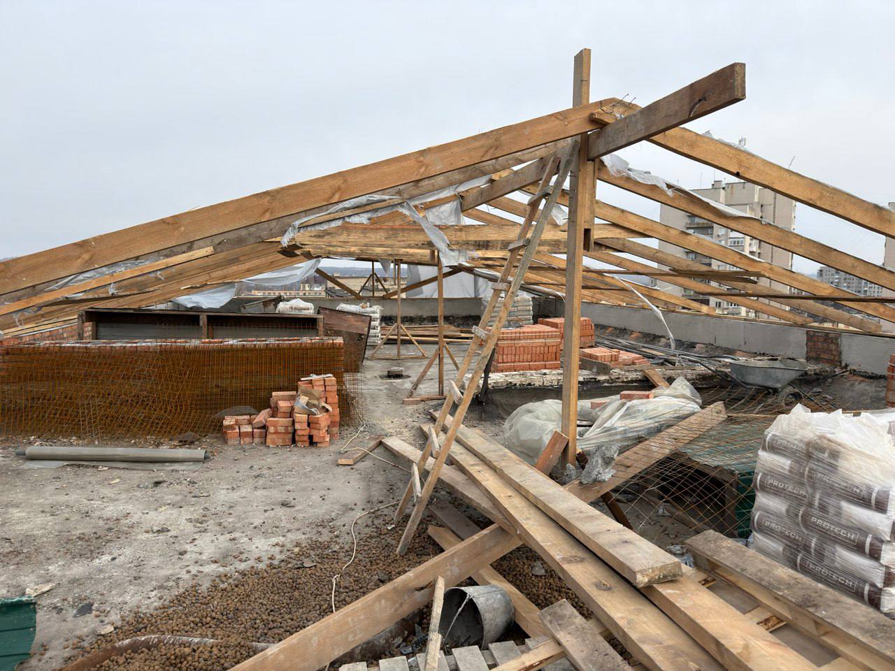 Восстановительные работы на объекте по адресу улица Петра Котова, 9, перешли в активную фазу устройства кровельного покрытия.