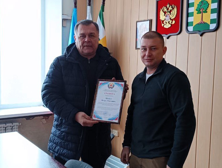 От имени Министра строительства и жилищнокоммунального хозяйства ЛНР вручил грамоту первому заместителю главы администрации города Рубежное — Игорю Олеговичу Шмидту.