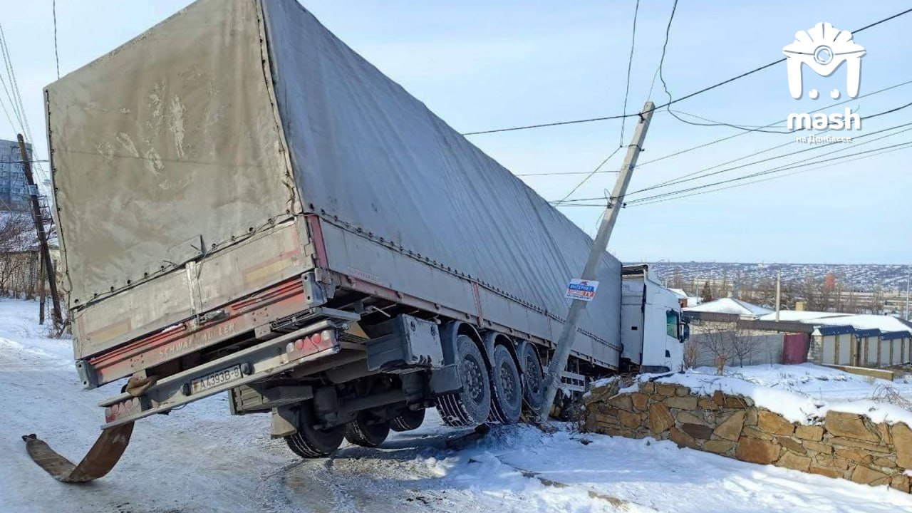 Водитель фуры случайно дрифтанул на скользкой дороге и протаранил забор частного дома в Луганске.