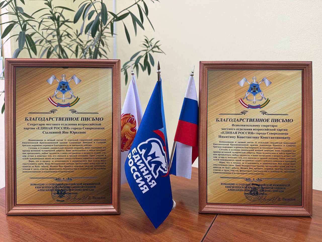 В знак признательности за поддержку, военнослужащие вручили благодарственные письма Секретарю Северодонецкого местного отделения партии "ЕДИНАЯ РОССИЯ" Яне Сылкиной и Исполнительному секретарю Константину Никитину. Письма переданы от командира бригады Д. Вязилова.