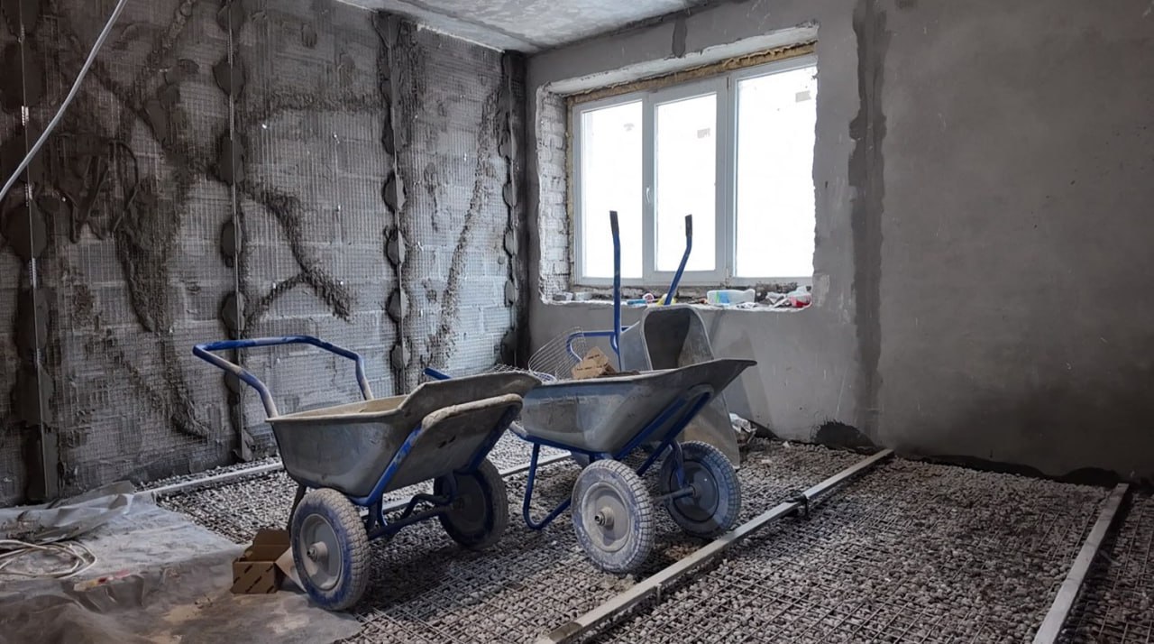 На текущий момент завершен демонтаж старой штукатурки и перегородок. Уже выложены новые стены, а пол подготовлен к заливке бетона, что является важным шагом в процессе реконструкции. Также начаты работы по оштукатуриванию стен.