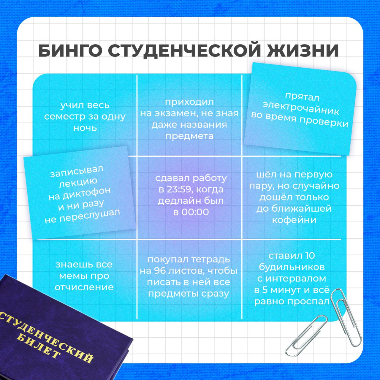 Университетскую пору всегда вспоминают с улыбкой и теплом в сердце, даже если бывало нелегко. Каждая клеточка этого бинго — как страницы из студенческого дневника.