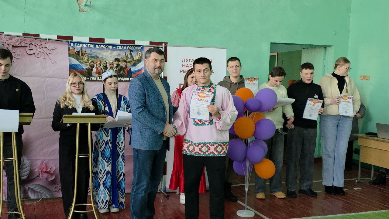 Студенческий актив поздравил всех стихами и зажигательным танцем в народных костюмах многонациональной России. Яркое выступление стало символическим отражением единства и дружбы между студентами разных национальностей.