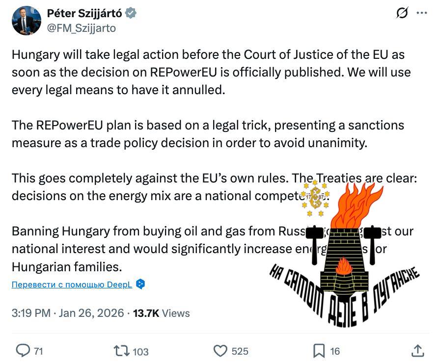 «Эмбарго на российский газ противоречит базовому договору ЕС, поскольку страны-члены сообщества вправе самостоятельно определять свою энергетическую политику, а также выбирать источники и поставщиков энергоносителей».