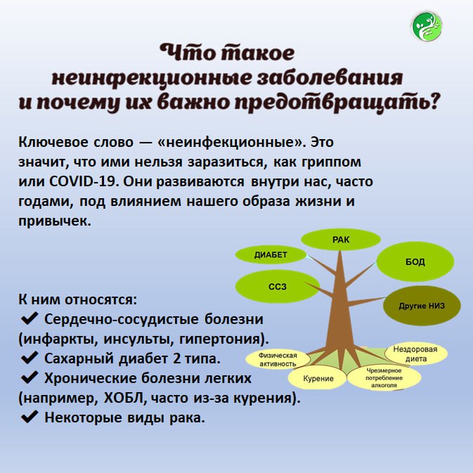 Перед вами — шпаргалка по главным врагам нашего здоровья, которых мы можем избежать. Это неинфекционные заболевания (НИЗ). Прочитайте эти карточки, чтобы понять, почему профилактика — это самый важный вклад в ваше здоровье.