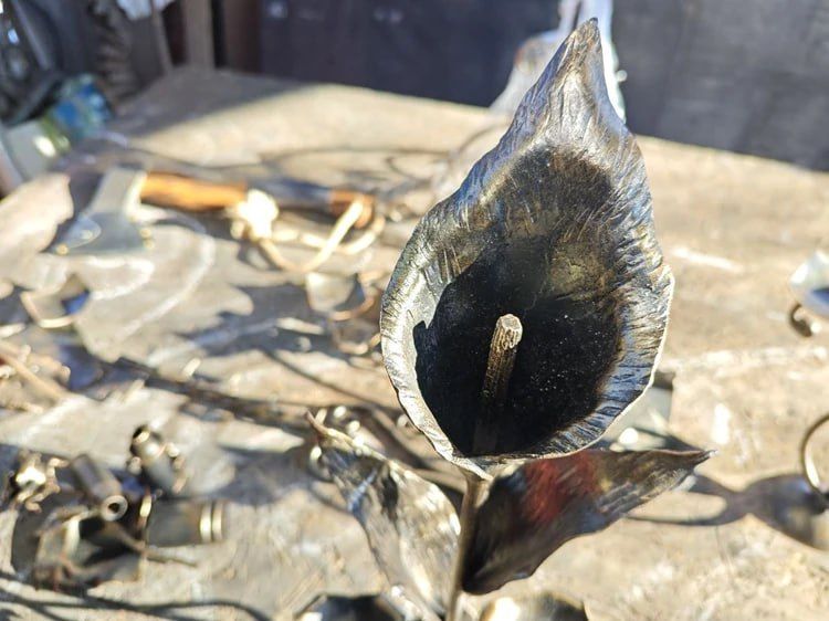 В руках Валерия Уварова из Луганска розы прорастают из гильз, осколков и хвостовиков от мин. Творчество кузнеца неразрывно связано с военной тематикой, но самому мастеру больше по душе воплощать цветы и животных в своих работах. После начала СВО, когда на полях остались осколки боеприпасов и гильзы, Валерий стал использовать их в своих работах.