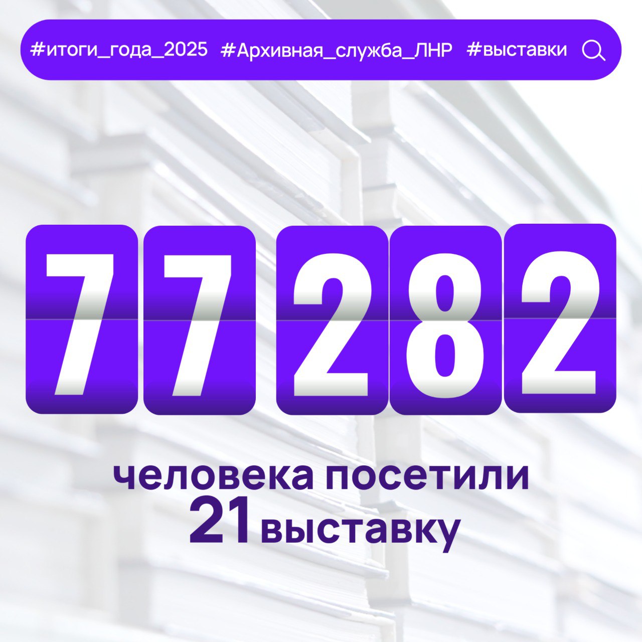 По итогам прошлого года архивными учреждениями республики была организована 21 выставка, которую посетило более 77 тысяч человек. На сайте Архивной службы ЛНР регулярно обновляются онлайнвыставки, которые позволяют в удобное для вас время ознакомиться с архивными документами и фотографиями, узнать историю родного края.