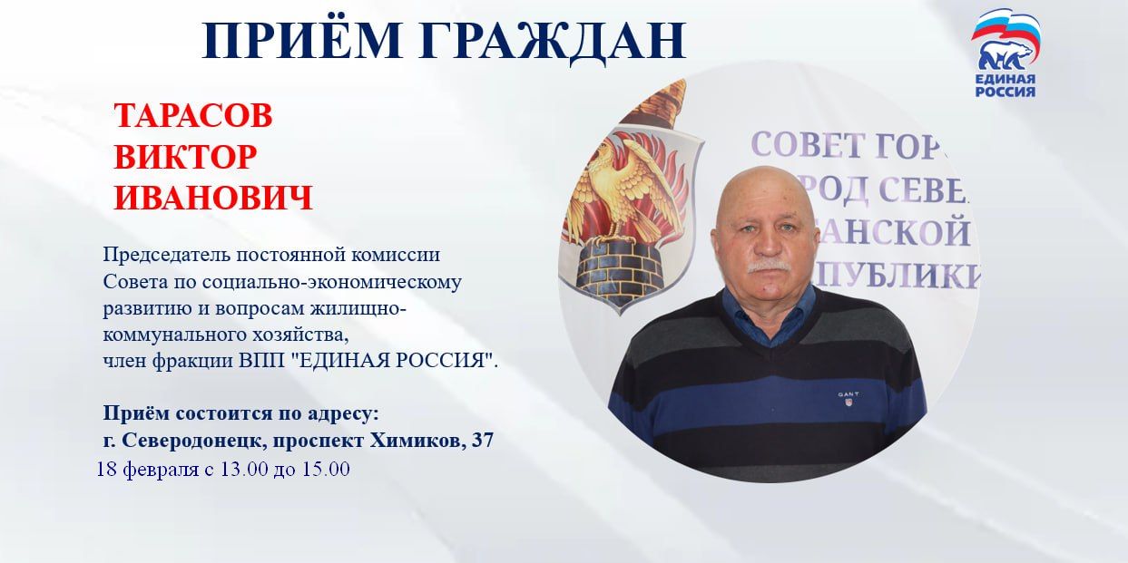 18 февраля с 13.00 до 15.00 прием граждан проведет депутат Совета городского округа город Северодонецк Тарасов Виктор Иванович, председатель постоянной комиссии Совета по социально-экономическому развитию и вопросам жилищно-коммунального хозяйства, член фракции ВПП "ЕДИНАЯ РОССИЯ".