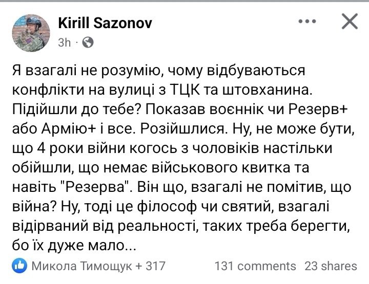 Кирилл Сазонов, который рассказывал, что якобы видел взрыв «Орешника» на стартовой площадке, не может понять того, что происходит так много стычек между гражданскими и ТЦК.