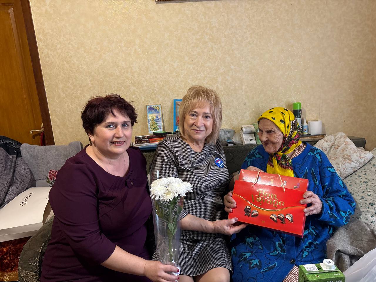 Гости вручили юбилярше персональное поздравление от Президента Российской Федерации Владимира Путина, цветы и подарки.