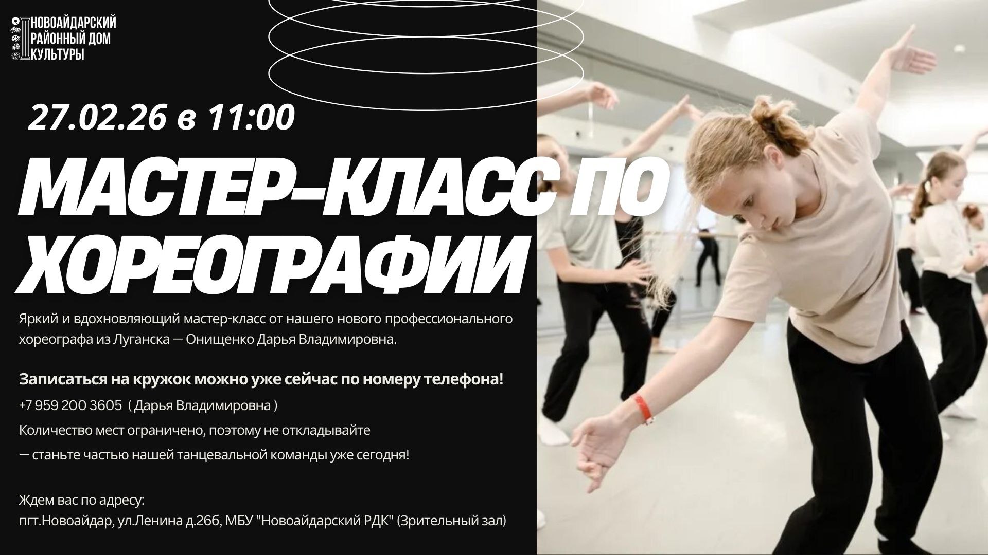 27 февраля 2026 года в 11:00 состоится яркий и вдохновляющий мастер-класс от нашего нового профессионального хореографа из Луганска — Онищенко Дарья Владимировна.