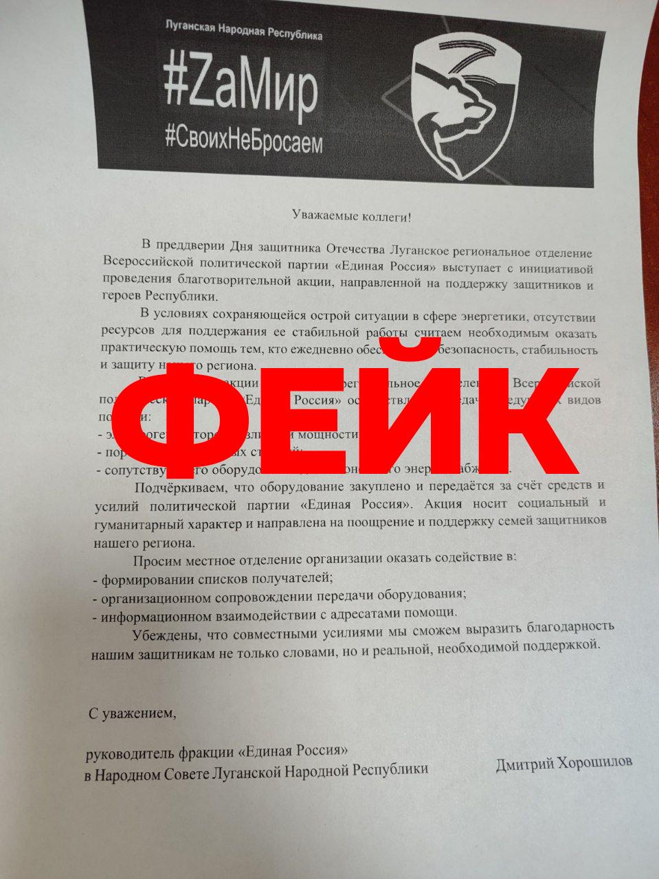 В муниципалитеты ЛНР приходят сообщения, якобы от имени руководителя фракции Единой России в Народном Совете ЛНР Дмитрия Хорошилова о старте акции #ZаМир по сбору гумпомощи участникам СВО ко Дню защитника Отечества. В письме указана просьба предоставить информацию о тех, кто нуждается в помощи.