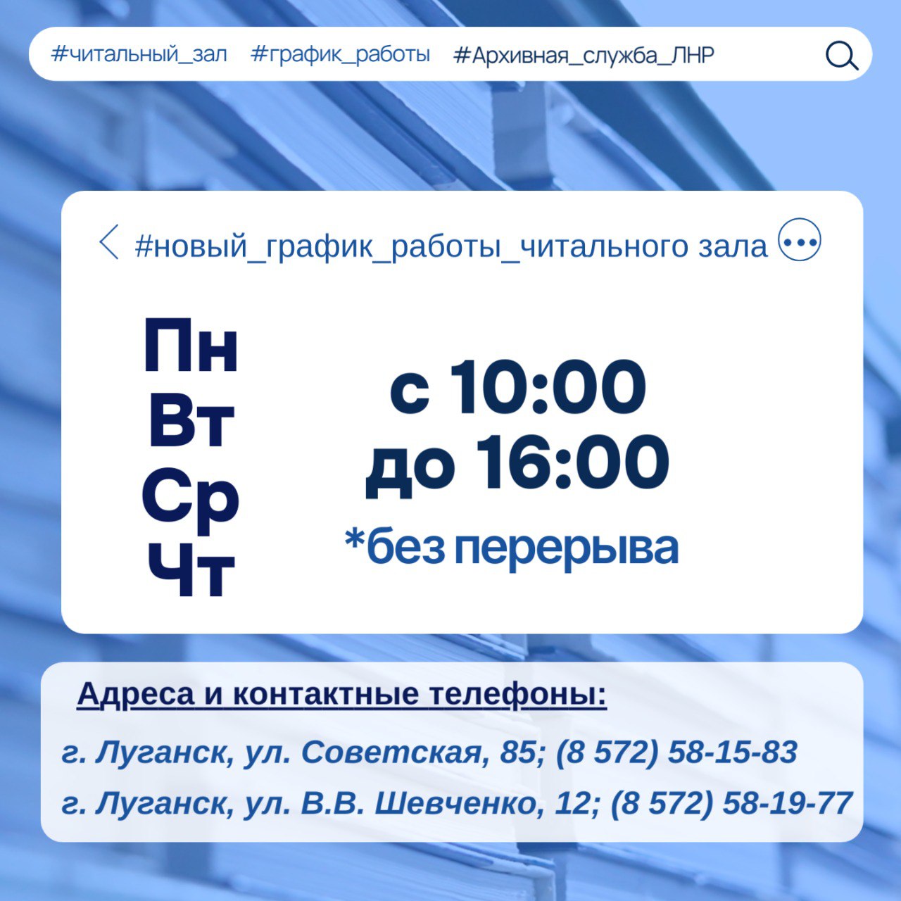 Новый график работы читальных залов Государственного архива ЛНР