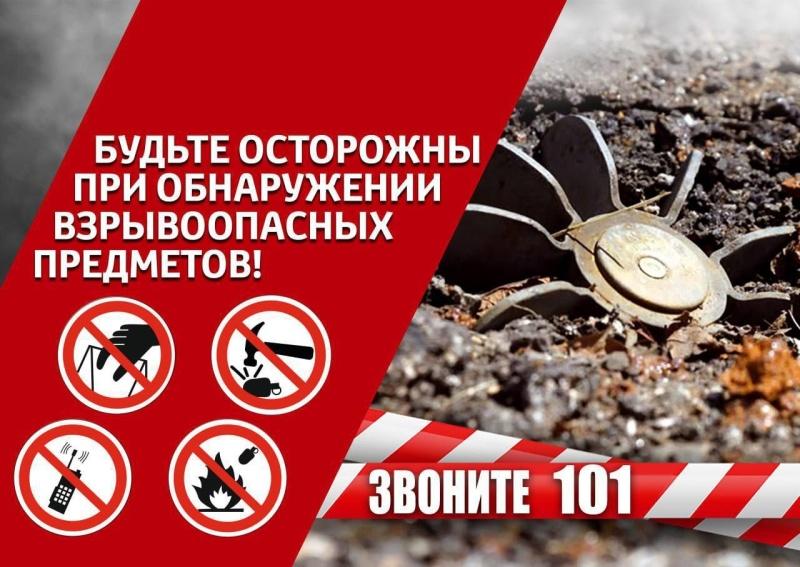 Немедленно сообщайте об обнаружении взрывоопасных предметов по телефону 101 или 102 (с мобильного - бесплатно).