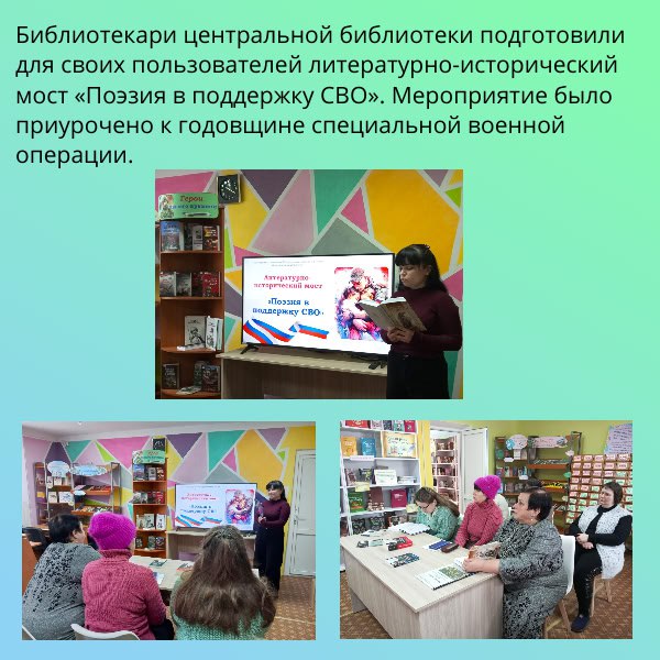 Библиотекари центральной библиотеки подготовили для своих пользователей литературно-исторический мост «Поэзия в поддержку СВО». Мероприятие было приурочено к годовщине специальной военной операции.