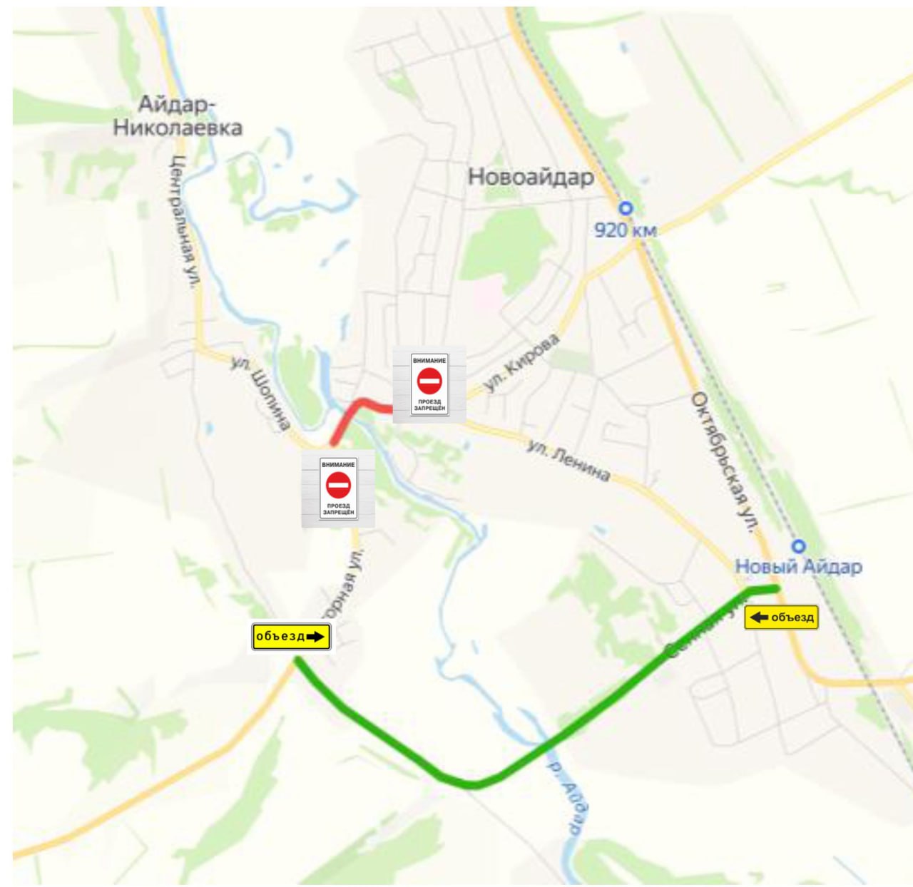В связи с резким поднятием уровня воды в реке Айдар, в целях обеспечения безопасности дорожного движения, проезд по мосту через реку в районе улицы Ленина пгт. Новоайдар - запрещен.