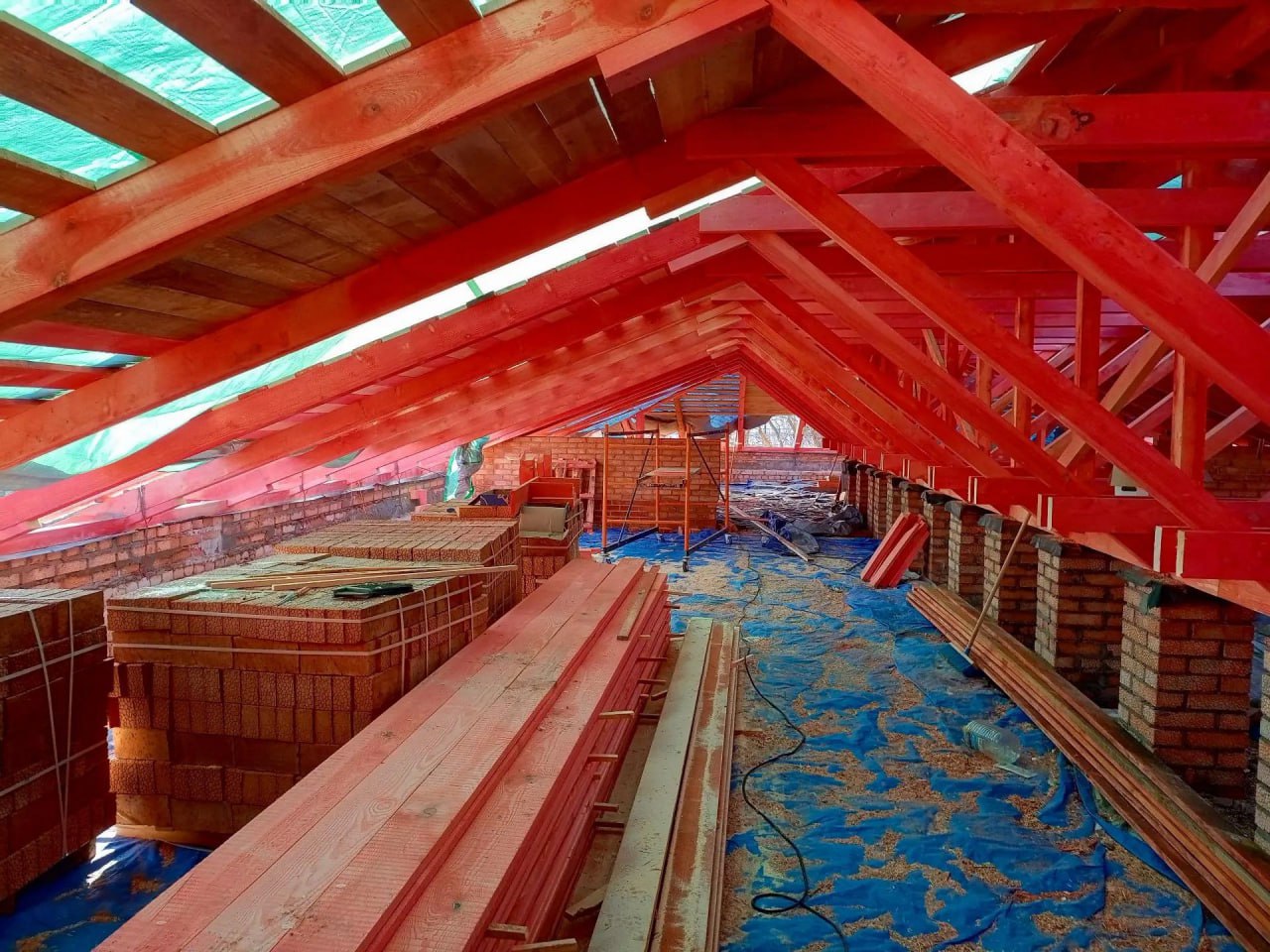 Специалисты демонтируют старые крыши и вентиляционные шахты. На их месте выкладывают новые шахты из керамического кирпича. По периметру домов устраивают монолитные пояса, на которые будут опираться новые стропильные системы, которые затем покроют металлическим профлистом.