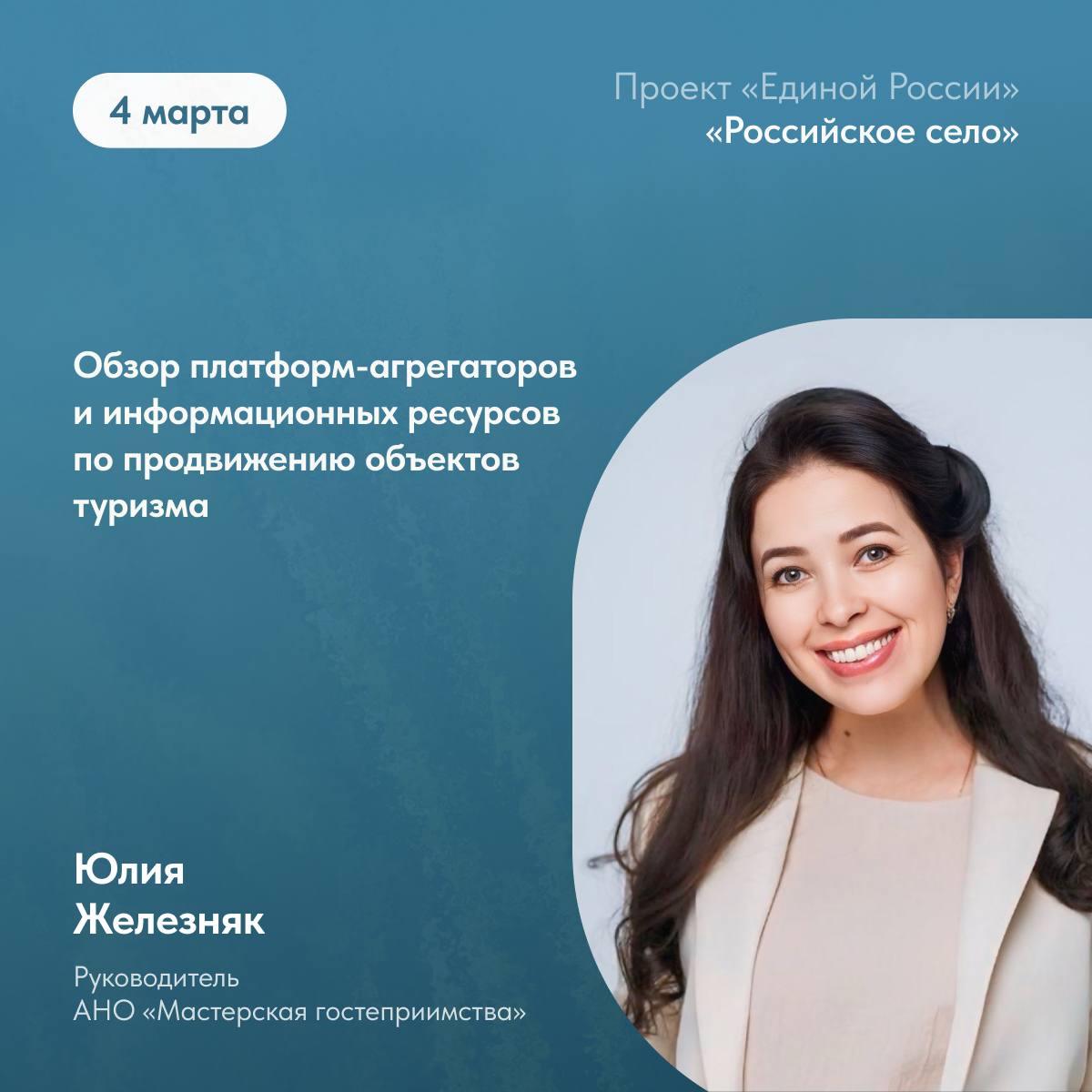 Модератор - Юлия Железняк, руководитель АНО «Мастерская гостеприимства».