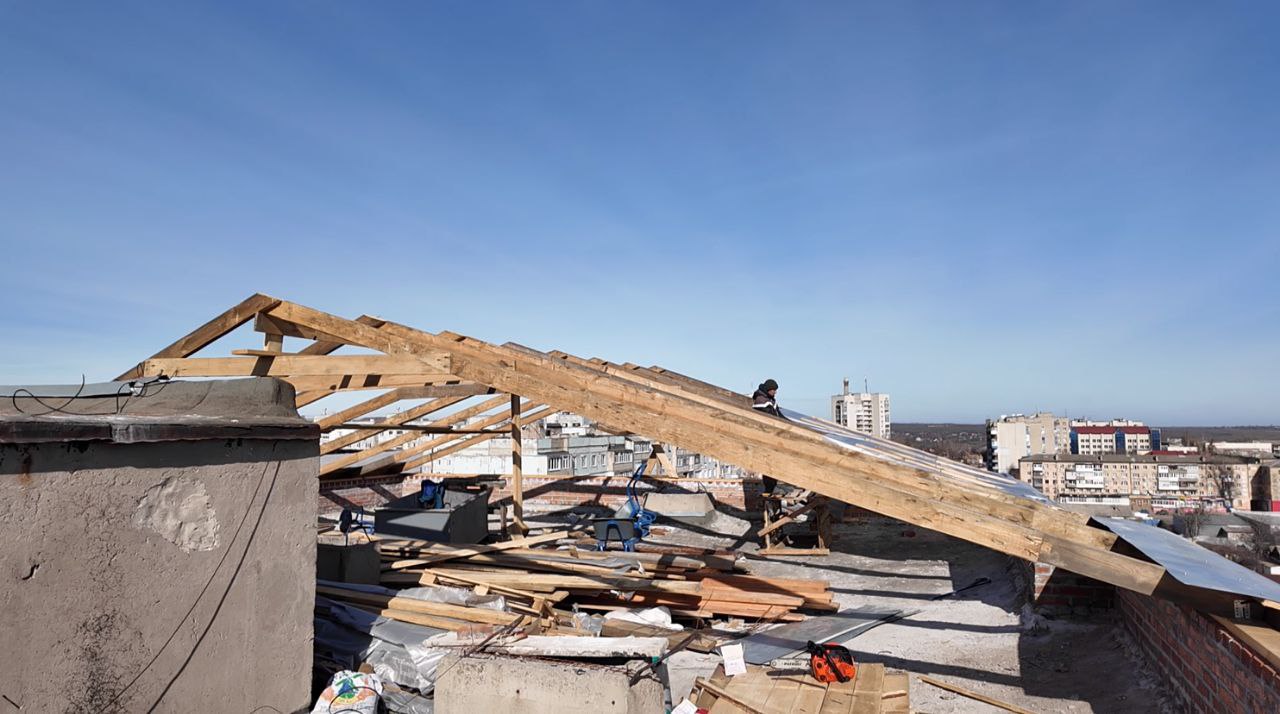 Специалисты строительной компании «СТИЛЛ» продолжают капитальный ремонт кровли на Советском, 1. Это один из самых сложных объектов на данный момент. Во-первых, это большая по площади кровля. Во-вторых, здесь очень большое количество аварийных плит, более 20. Сегодня на первой секции завершается пайка второго слоя, строители разбирают временную кровлю. На второй секции завершается установка временной кровли.