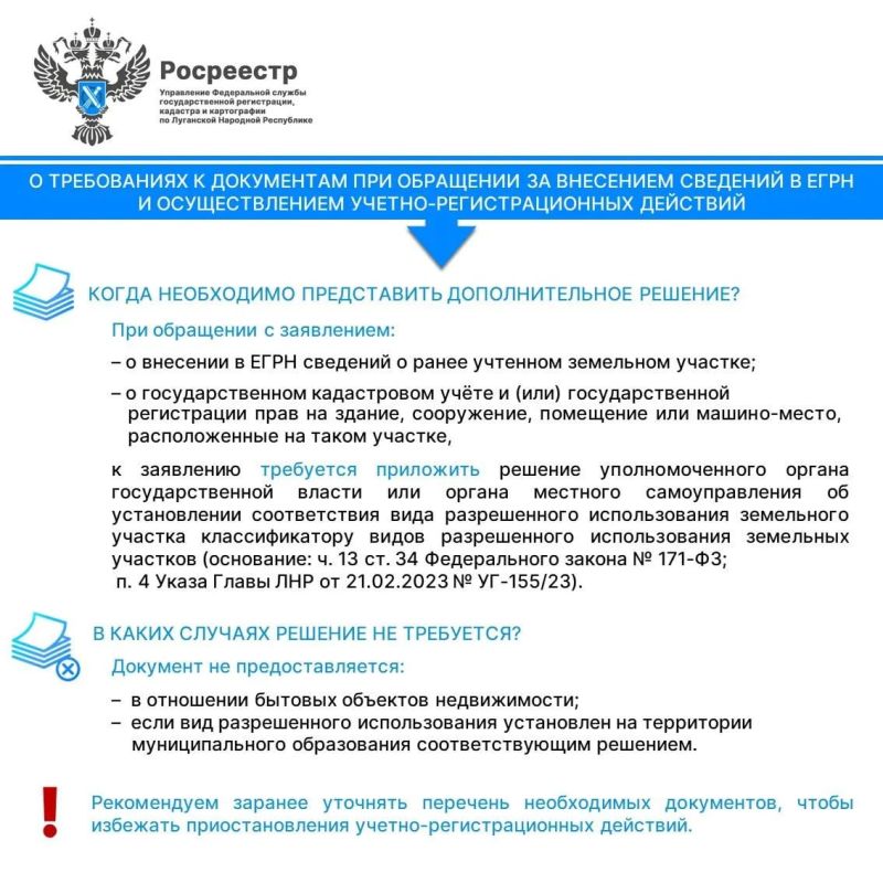 Управление Росреестра по Луганской Народной Республике напомнило о требованиях к документам при обращении граждан для внесения сведений в ЕГРН и для осуществления учетно-регистрационных действий.