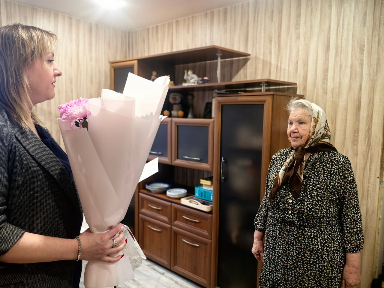 Начальник управления внутренней политики Юлия Севостьянова передала имениннице поздравительный конверт из Кремля, вручила цветы и подарок, пожелав крепкого здоровья, тепла, внимания близких и долгих лет жизни.