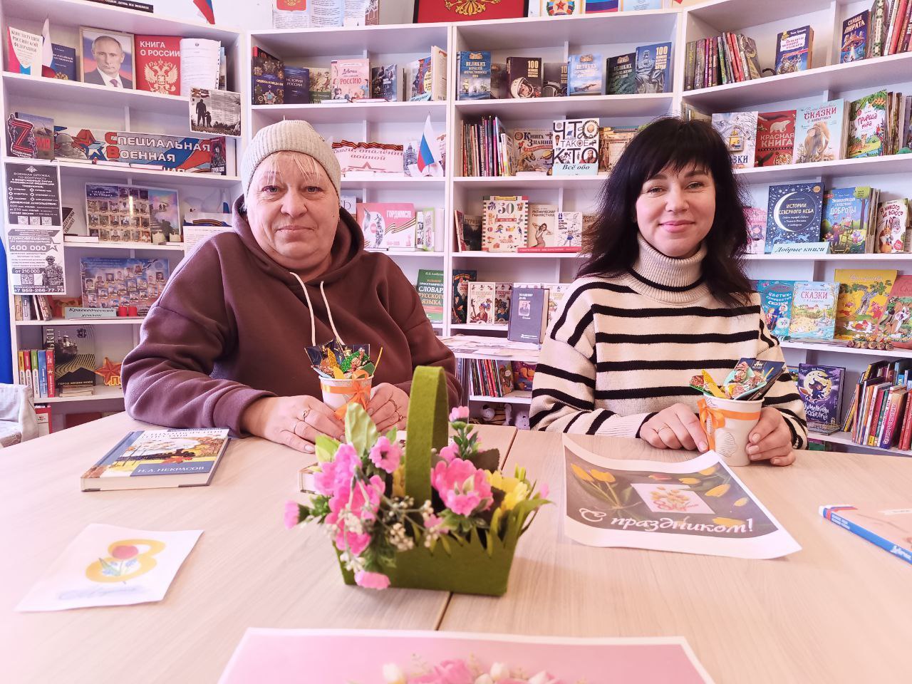 Сотрудники ДК поздравили жён и дочерей участников специальной военной операции с Международным женским Днём 8 Марта, с пожеланиями терпения, мужества и здоровья. А также подарили весенние памятные открытки.