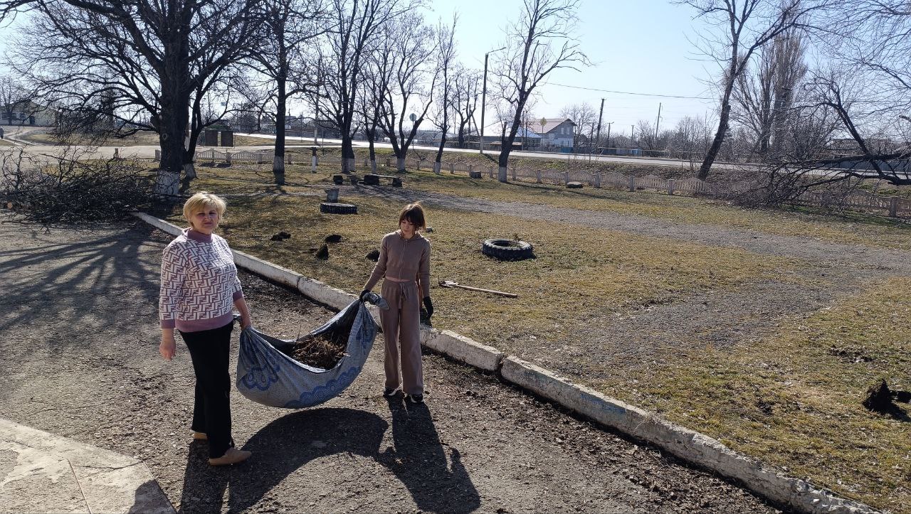 Работники местного клуба, убрали опавшую листву, спилили сухие ветки и несколько старых деревьев. Особое внимание уделили клумбе: пропололи, взрыхлили землю и посадили новые розы.
