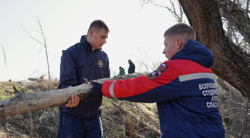 - Студенты-спасатели помогают в расчистке реки Лугань.